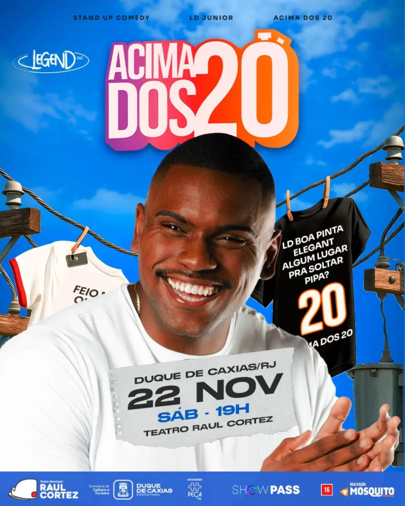Entre zoeiras, reflexões e risadas garantidas, LD traz ao palco a mesma energia que já conquistou milhões nas redes. “Acima dos 20” é para quem cresceu, mas não deixou de se divertir. Para quem vive entre boletos e B.O.s, mas ainda acredita no brilho próprio.