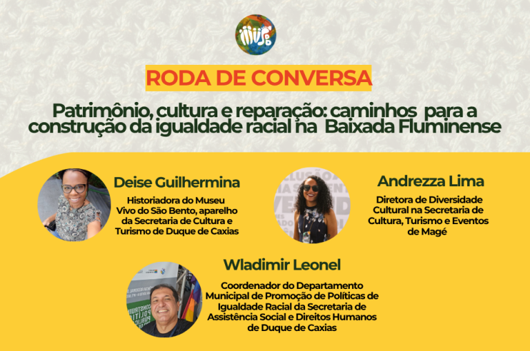 Na próxima quarta-feira (26/11), às 14h, o Museu Vivo do São Bento irá promover a Roda de Conversa “Patrimônio, cultura e reparação: caminhos para a construção da igualdade racial na Baixada Fluminense”. Irão integrar a mesa: ➡ Deise Guilhermina: Doutora e mestre em Educação formada pela Universidade Federal Fluminense , linha de pesquisa “Negro e … Continue lendo Museu Vivo do São Bento promove Roda de Conversa sobre igualdade racial na Baixada Fluminense