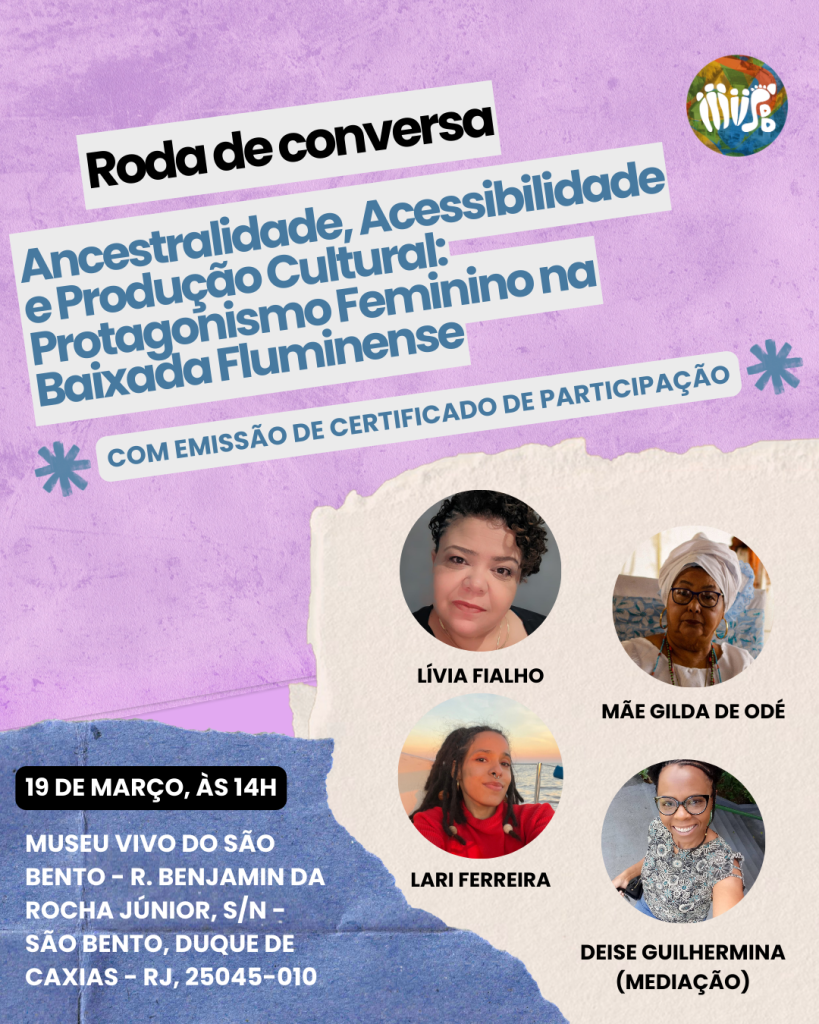 No dia 19 de março, às 14h, o Museu Vivo do São Bento (MVSB), em Duque de Caxias, vai promover a Roda de Conversa “Ancestralidade, Acessibilidade e Produção Cultural: Protagonismo Feminino na Baixada Fluminense”. A atividade vai ocorrer na Sede Administrativa do MVSB e vai contar com emissão de certificado de participação (horas complementares). É necessário sinalizar que deseja o documento no ato da inscrição via formulário disponibilizado logo abaixo.